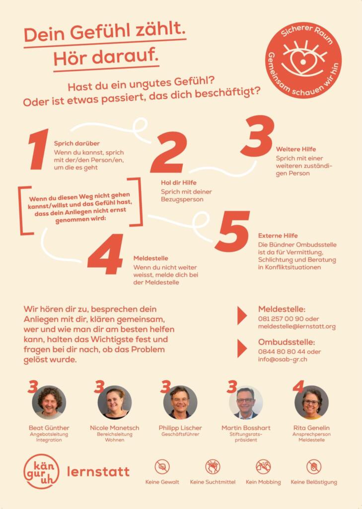 Nachdem du eine Meldung gemacht hast – sei es intern oder extern, per Mail, Telefon, persönlich oder auch mit einem Brief oder Zettel – wird deine Meldung vertraulich behandelt. Die zuständige Stelle hört dir zu und nimmt dein Anliegen ernst. Gemeinsam wird geschaut, wie die Situation verbessert werden kann und welche weiteren Schritte nötig sind. Du wirst über die nächsten Schritte informiert und erhältst Unterstützung, damit du dich wieder sicher und wohlfühlen kannst.